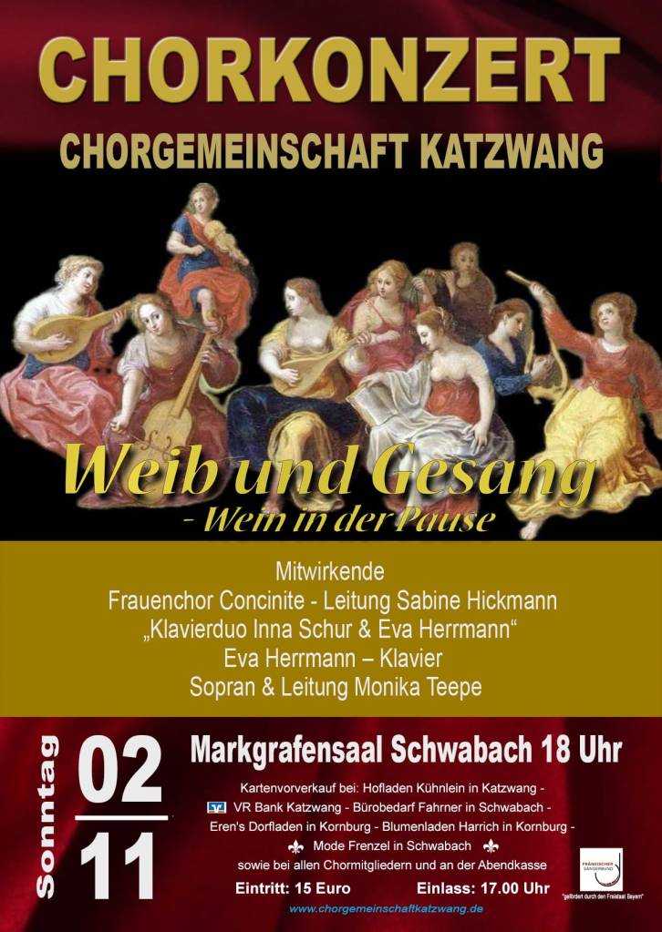 Die Chorgemeinschaft Katzwang lädt zum großen Konzert im Markgrafensaal. Weib und Gesang lautet das Motto, das Programm führt schwungvoll durch musikalische Welten der Frauenchor Literatur wie Filmmusik neue Volkslieder, neue geistliche Musik und berühmte Pop Evergreens. Dazu hört man fantastische und virtuose Klaviermusik von Rachmaninow und John Williams. Monika Teepe führt durch das Programm der FrauenchorConcinite und das Klavierduona Schur und Eva Hermann unterhalten auf höchsten Niveau.